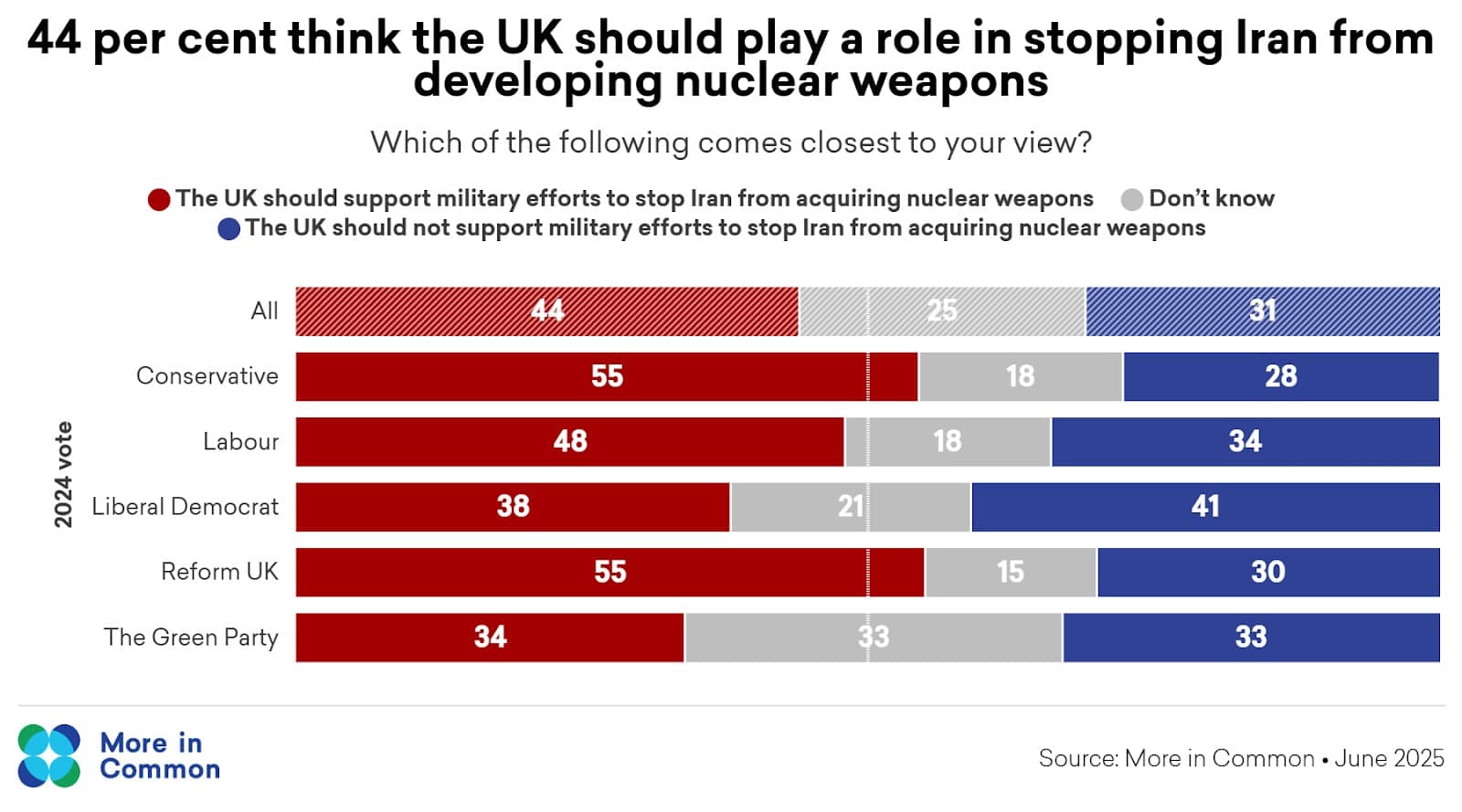 Across the land, 44 % of Brits feel the UK should step in militarily to prevent Iran from getting nuclear weapons.