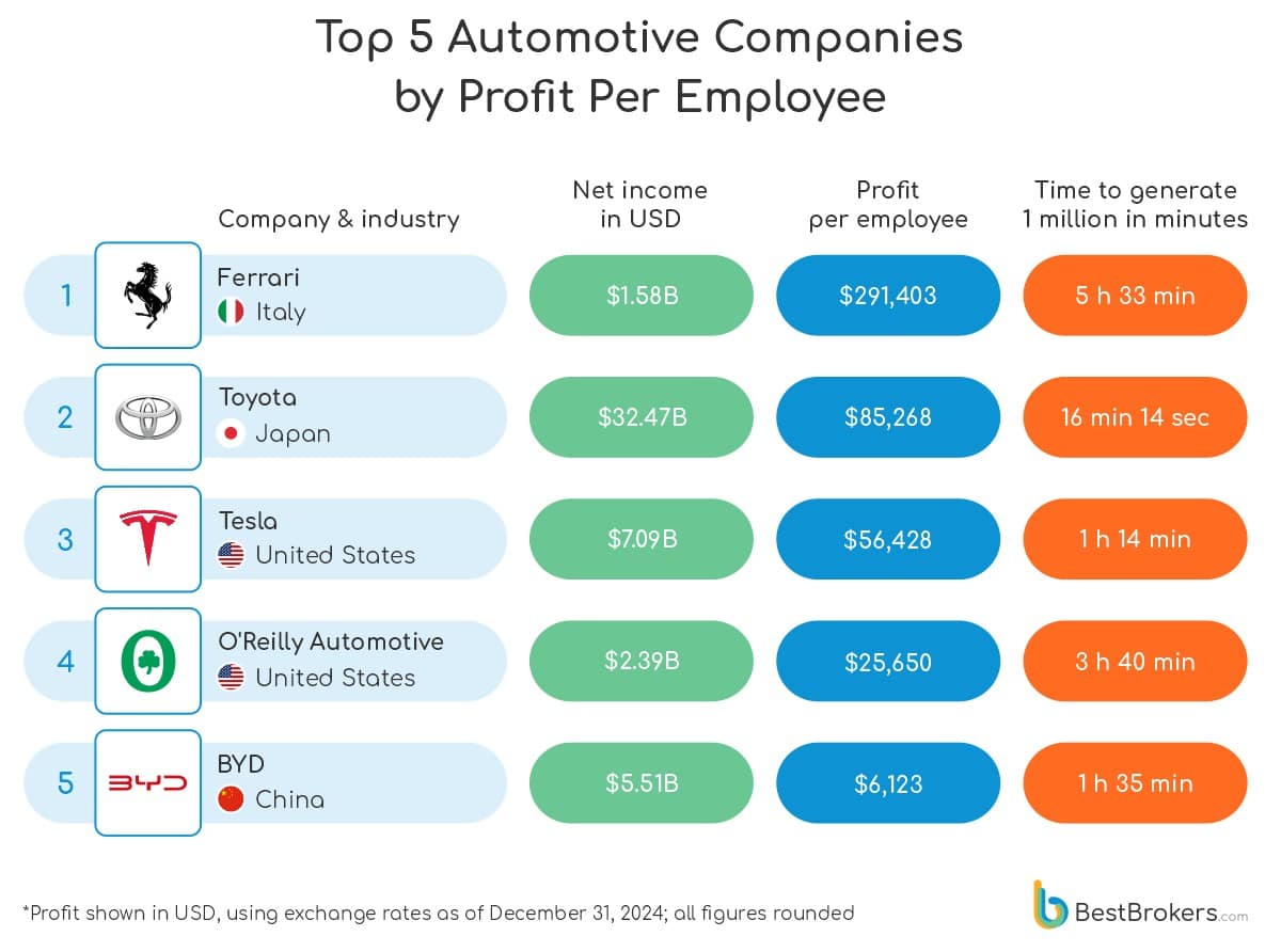 The Chinese company BYD ranks last with just $6,123 of net profit per employee, 48 times less than Ferrari, despite having a significantly larger annual net profit than both Ferrari and O’Reilly Automotive.