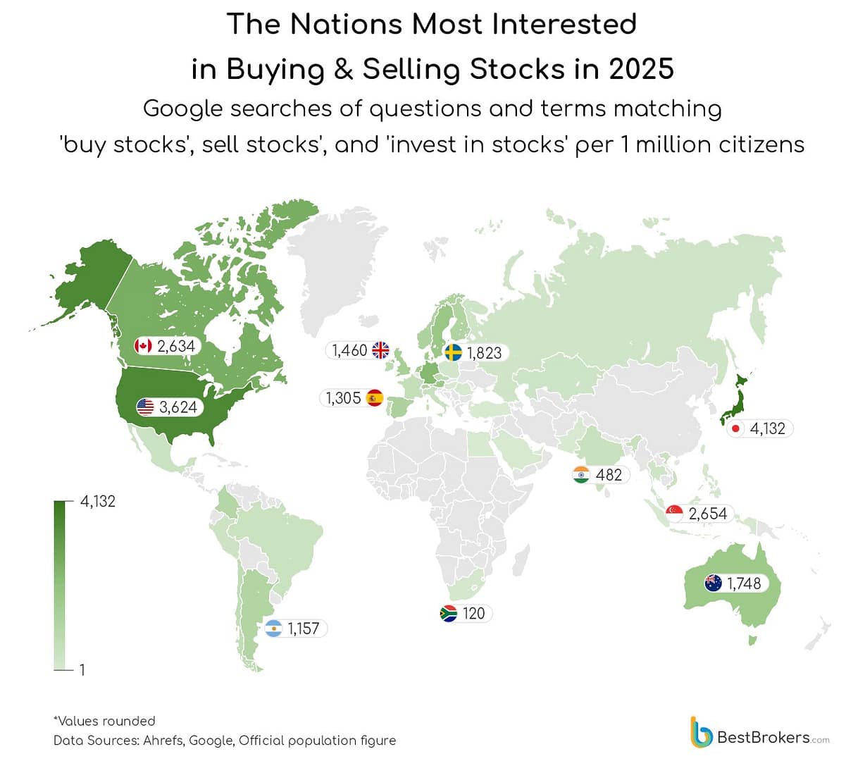 Hold on to your seats: Japan is the king of stock chatter per million folks. Anyone searching for “buy stocks,” “sell stocks,” or “invest in stocks” in Japanese sees a massive monthly average of 4,132 questions per million people. That’s a staggering 510,110 questions each month.