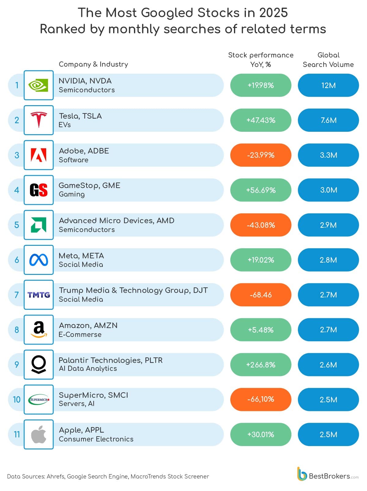 Where do the most people want to get their hands on? NVIDIA wins hands down with roughly 12 million monthly Google searches. That’s not a small sum—NVIDIA’s share price has leapt nearly 20% over the last year and surged a mind‑blowing 1,700% in five years.