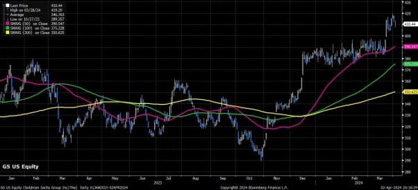 - So if you’re watching the market, Goldman’s been bumping up, staying in rhythm with the crowd.