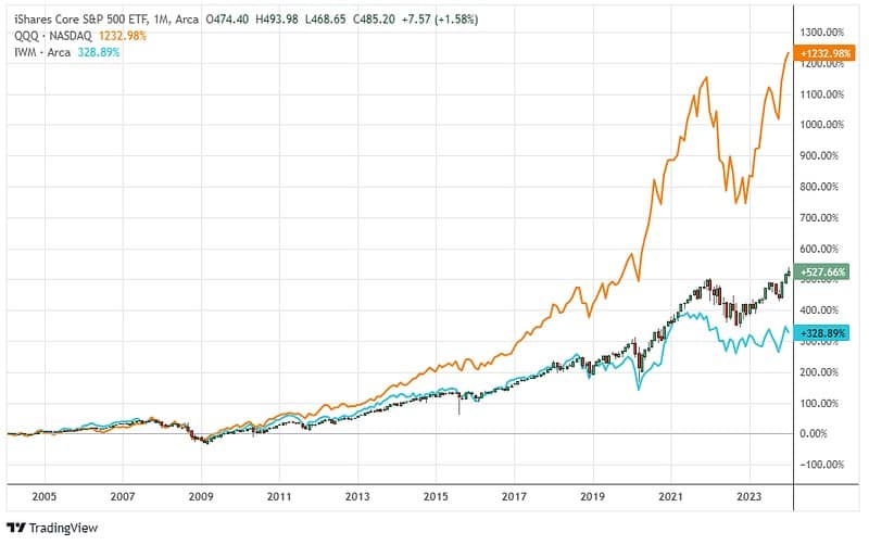 As you can see, the Nasdaq 100 has been the absolute rockstar, soaring over a thousand percent. The S&P 500 delivers steady growth, while the Russell 2000 provides a modest climb for the smaller company lovers.