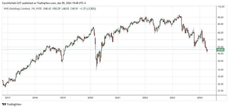 - As of April 9, WNS closed at $49.91, giving a P/E ratio of 15.3 – the lowest in a decade.